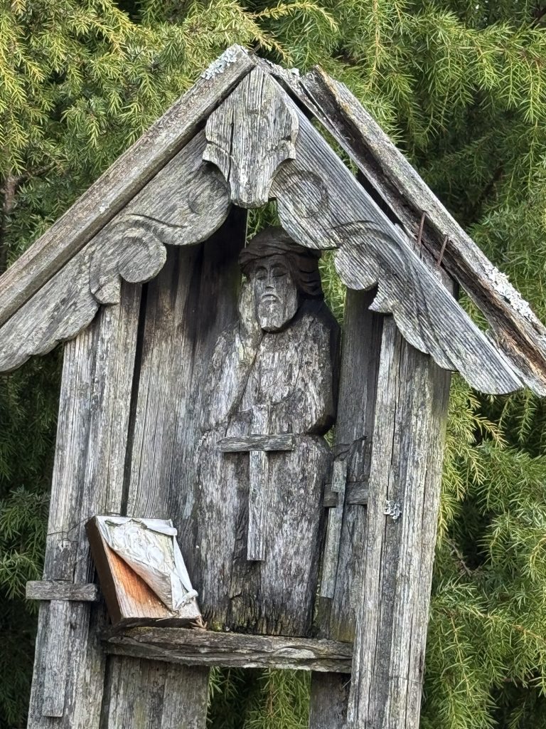 Yeah, it looked pretty much the way it sounded. A hill of crosses. James in his red hat is clearly having a spiritual moment.