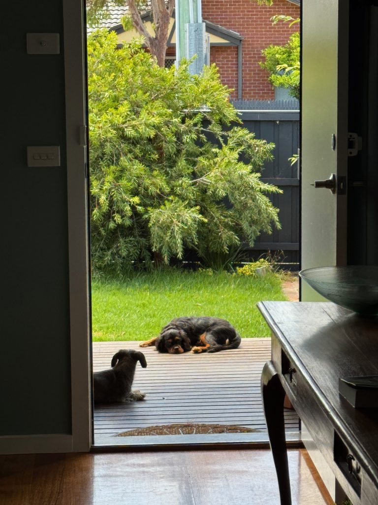 This photo is when we were visiting Mum yesterday at Bonbeach. My brother and sister-in-law were there at the same time, and Hazel fell asleep on Liz’s lap. Isn’t it funny how boneless puppies get when they’re deeply asleep?