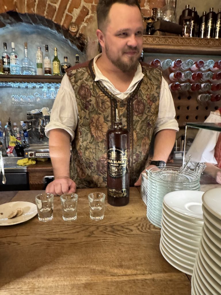 There is a traditional Latvian drink we tried. First we had shots of the traditional type, then the blackcurrant version. James and I liked both, and they certainly warmed us up.