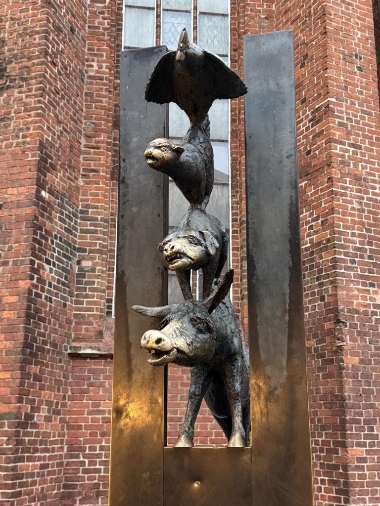The musicians of Bremen. It’s a Brothers Grimm fairy tale. I touched the snout of the bottom one for luck. The others were all too high.